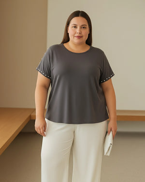 Introducing our Beaded Top — a fancy-meets-comfy plus size top designed for effortless style. Crafted from imported knitted fabric with a flattering loose fit, it’s stretchy, breathable, and perfect for spring and summer. The round neckline and short sleeves are elevated with dainty pearl embellishments for a classy, fashionable look. Built to last with flawless stitching and a neat, crisp hem, this versatile top comes in trendy colors including beige, black, chocolate brown, grey, and dark grey.