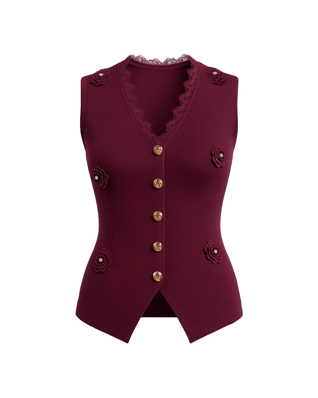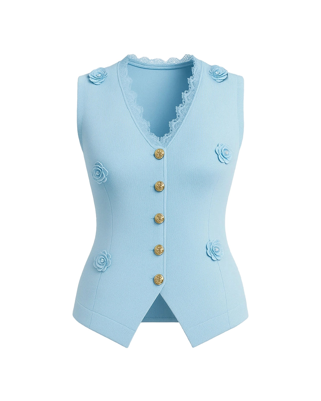 Crafted from luxe ribbed fabric with slight stretch, this waistcoat features elegant 3D flower accents, scalloped lace trimming, and signature gold buttons.