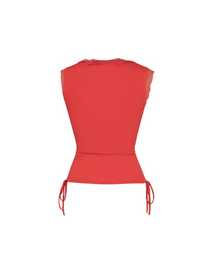 Woman wearing a red sleeveless top and white shorts in a living room setting