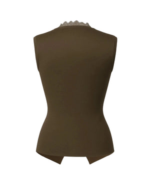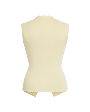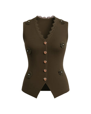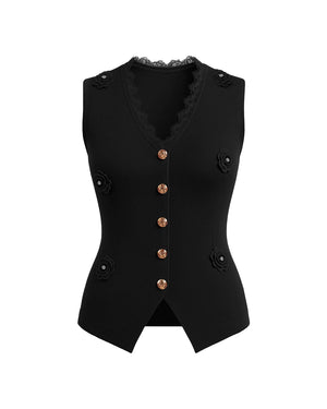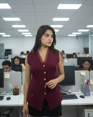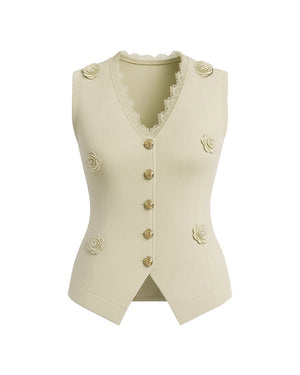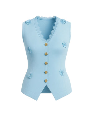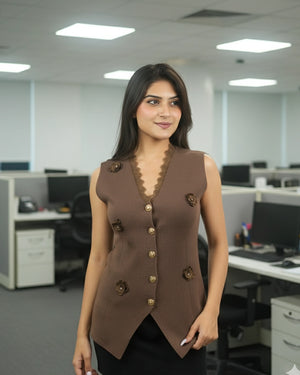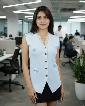 Introducing our new product, the Luxe Waistcoat with Flower Gold Button — a showstopping piece that blends sophistication with a touch of femininity. Crafted from luxe ribbed fabric with slight stretch, this waistcoat features elegant 3D flower accents, scalloped lace trimming, and signature gold buttons. The pointed hemline and sleeveless cut enhance the tailored fit, flattering all body shapes from XS to L. Ideal for brunches, formal occasions, or special events, this beautifully structured waistcoat is a standout layering piece in any stylish wardrobe.